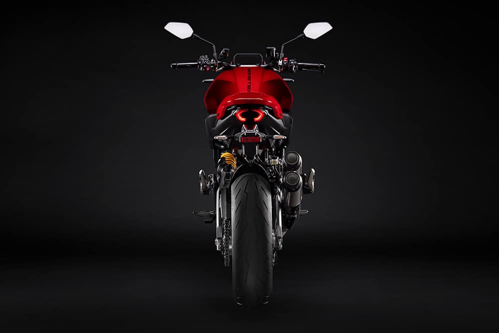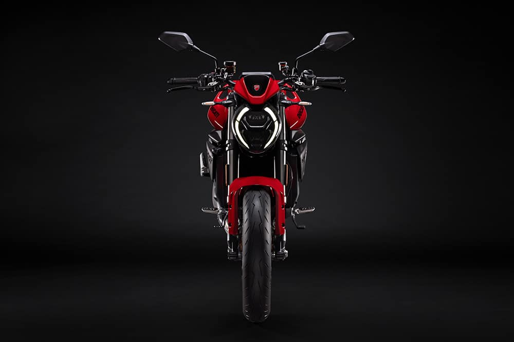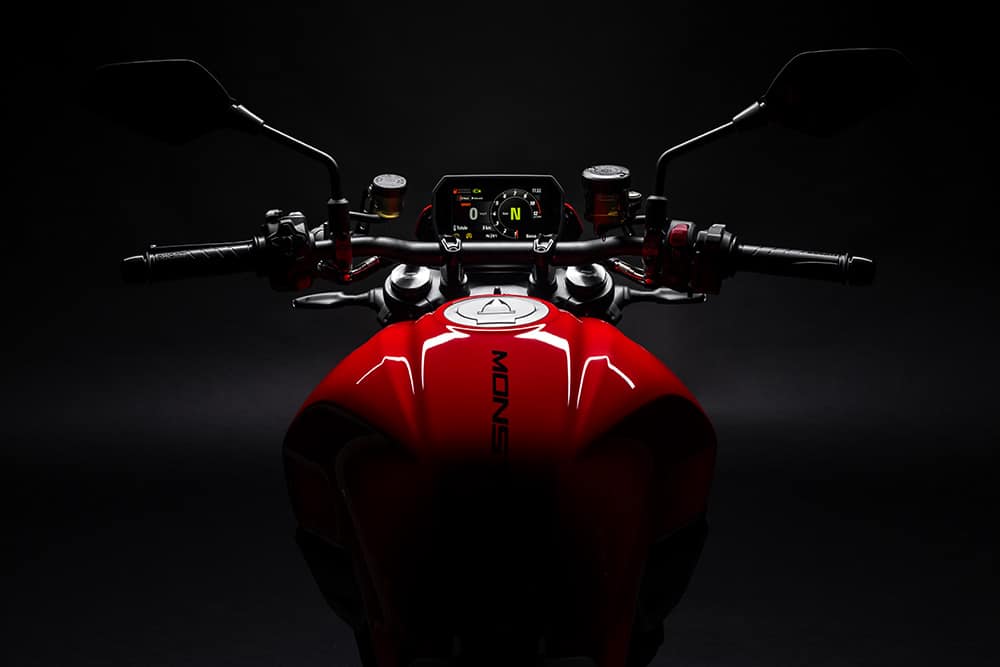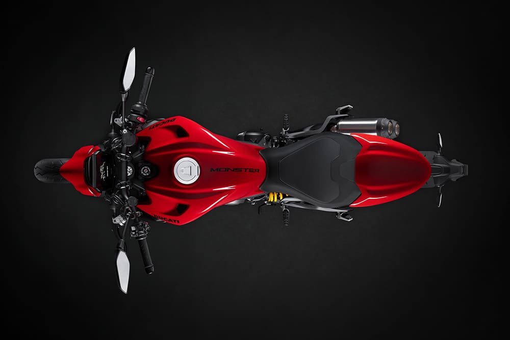 Het uiterlijk van de nieuwe Monster is volledig vernieuwd, waarbij de motorfiets slanker en compacter oogt. Het ontwerp behoudt de kenmerkende elementen: de koplamp die wordt geflankeerd door de tank, en een korte, lichte achterkant. De tank, met zijn ‘bizon-rug’ vorm, is aangepast om de slankere profielen te combineren met de typische gespierde uitstraling van het model. De koplamp is een volledig LED-unit met een modern uiterlijk. De vorm is een dubbele ‘C’, een designelement dat de naked-modellen van Ducati verbindt. Het zadel is met 815 mm lager en smaller dan voorheen, wat het gemakkelijker maakt voor de bestuurder om de voeten op de grond te zetten. De zijpanelen zijn voorzien van het Ducati-logo en de coördinaten van de fabriek in Borgo Panigale.