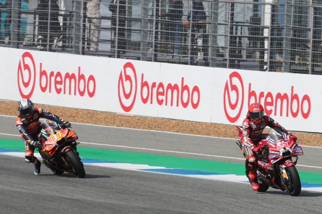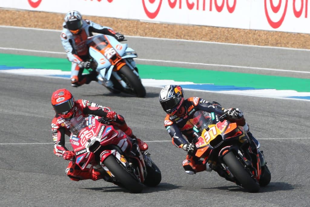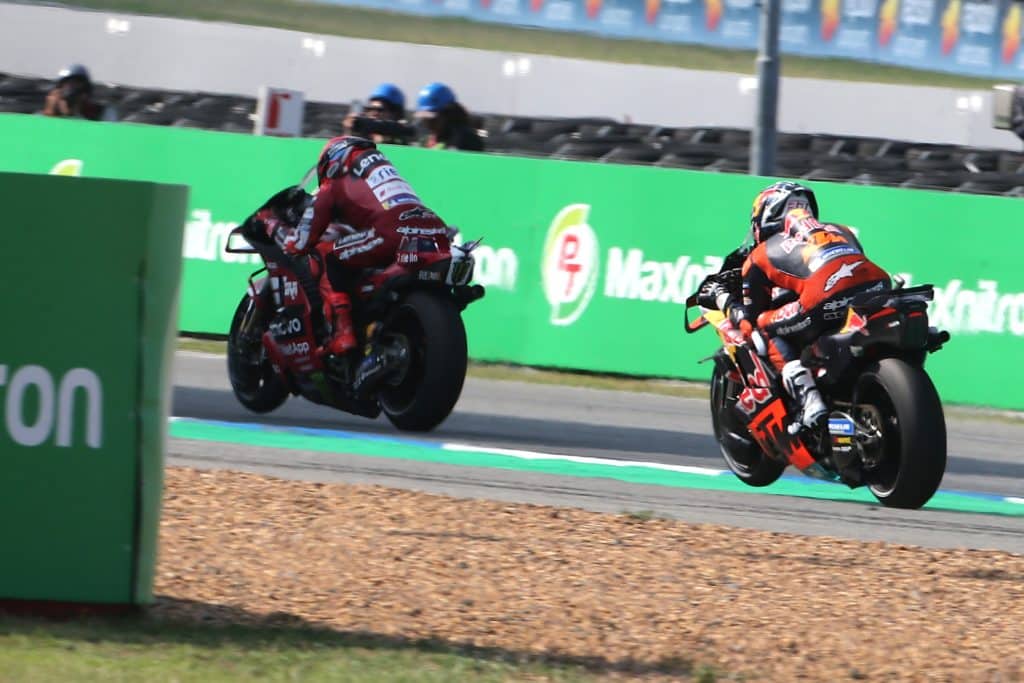 Het kantelpunt van de race in Thailand kwam in de voorlaatste ronde toen Marquez en Acosta contact maakten, wat resulteerde in een straf voor Marquez (#93). Dit gaf Acosta mede de kans om zijn allereerste Sprint Race-overwinning te behalen en zich de eerste KTM-rijder te maken die aan de leiding staat in het MotoGP Wereldkampioenschap. Mede, want hij reed natuurlijk ook ijzersterk, zoals Marquez na afloop eerlijk bevestigde. Marquez moest zich na de straf tevreden stellen met de tweede plaats, terwijl Raul Fernandez van het Trackhouse MotoGP Team het podium completeerde op zaterdag. De race begon met Marco Bezzecchi van Aprilia Racing, die sterk van start ging. Helaas verloor hij de controle en crashte net voordat de vuurwerkshow tussen Acosta (#37) en Marquez losbarstte.