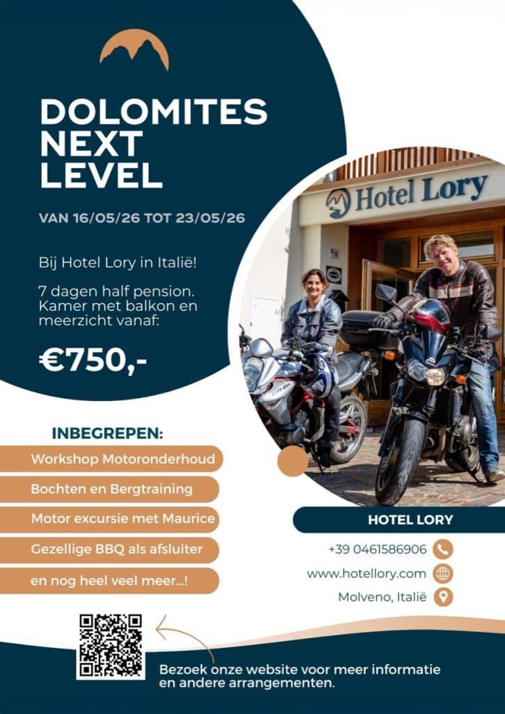 Van 16 tot 23 mei organiseert Hotel Lory in Molveno het arrangement “Dolomites Next Level”. Deze week combineert het ultieme motoravontuur met ontspanning in de indrukwekkende Dolomieten.