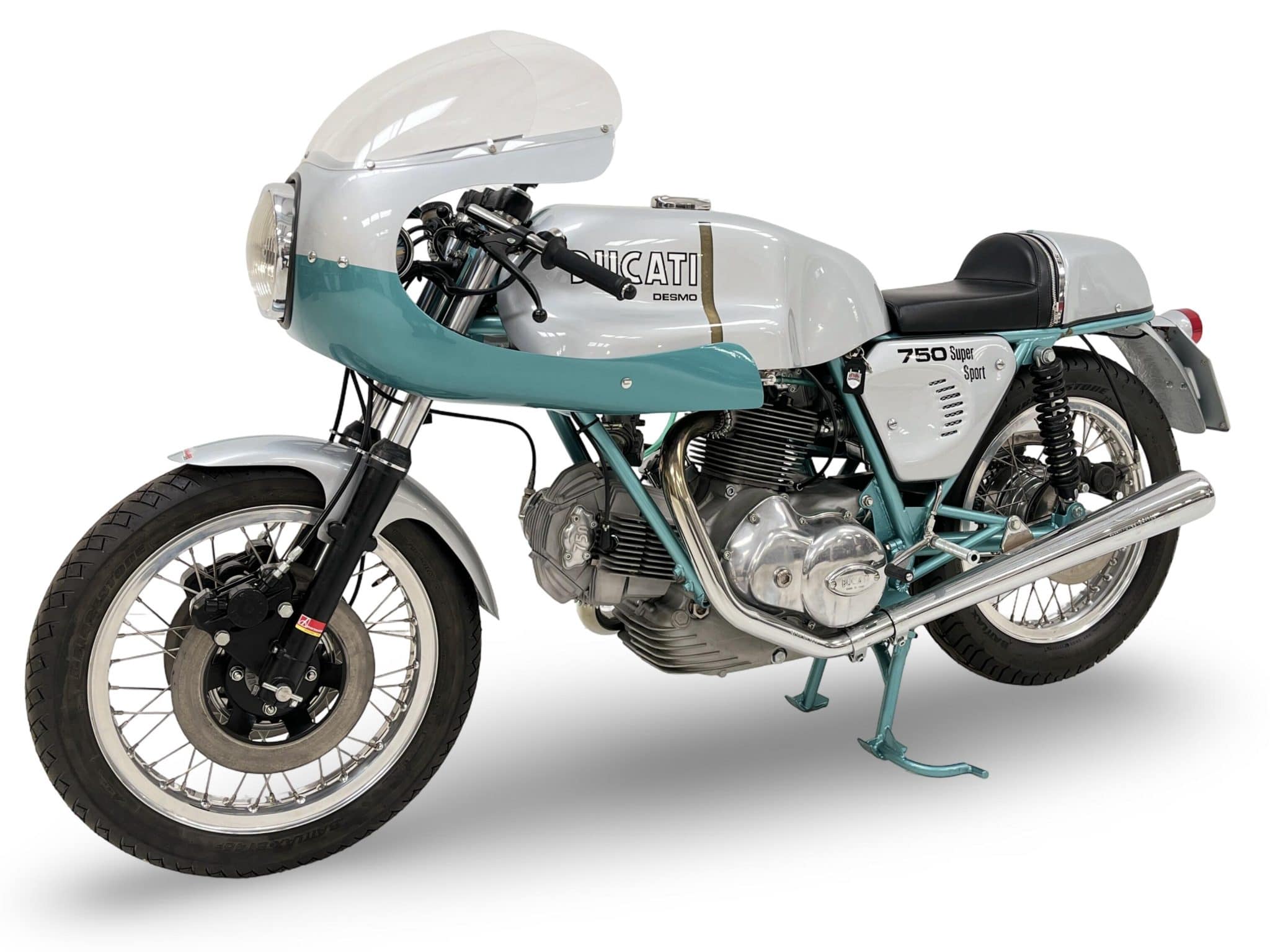 De 1974 Ducati 750 SS is een V-Twin café racer met een 748cc L-twin motor. Deze motor heeft desmodromische klepbediening, wat zorgt voor hogere toerentallen en precisie. Met een vermogen van 67 tot 73 pk en een topsnelheid van 210 tot 220 km/u was dit een indrukwekkende motor voor zijn tijd. Het gewicht van ongeveer 180 kg maakte hem wendbaar.