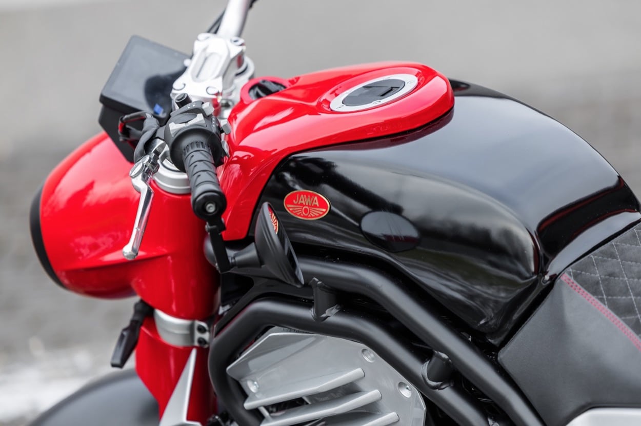 Waar Jawa echt een eigen stempel drukt, is het frame. In plaats van een aluminium frame zoals bij de Jedi-basis, kiest de 730 Twin voor een stalen buizenframe met dubbele ligger. Het staal past bij het rauwe caféracerkarakter en kan tegelijk zorgen voor een solide, voorspelbaar rijgevoel. De achterbrug blijft wel aluminium, zodat het geheel niet te log wordt. De vering komt van Kayaba (KYB) en is zowel voor- als achteraan instelbaar. Remmen doet de Jawa dankzij Brembo, ondersteund door Bosch ABS. Om de lichtmetalen wielen ligt vooraan een 120/70-17-slof en achteraan een 180/55-17 band. Een set-up die aansluit bij het sportieve profiel dat Jawa duidelijk wil neerzetten.
