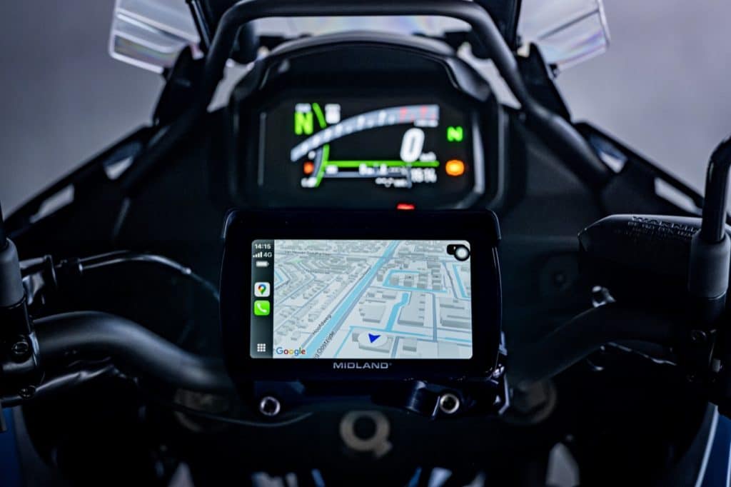 De Midland BikePlay PRO beschikt over een stevig, waterdicht 5,5-inch touchscreen dat onder alle omstandigheden goed leesbaar is en ook met handschoenen eenvoudig te bedienen blijft. Dankzij Apple CarPlay en Android Auto krijg je toegang tot navigatie, verkeersinformatie, muziek en communicatiefuncties. Via spraakbesturing met Siri of Google Assistant blijven de handen veilig aan het stuur.