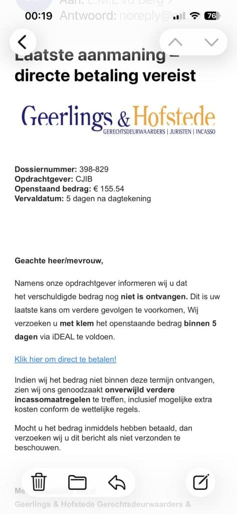 Motorrijders weten het als geen ander: alert zijn redt soms letterlijk de dag. Toch is de digitale snelweg minstens zo verraderlijk. Zo duiken er mails op van een zogenaamd incassobureau Geerlings & Hofstede, met een “laatste aanmaning” namens het CJIB. Klinkt officieel, maar het is pure flauwekul. Het telefoonnummer? Nep. De afzender? Onjuist. En het CJIB? Heeft hier niets mee te maken, aldus AVROTROS Opgelicht?!, dat hierover meerdere meldingen ontving.