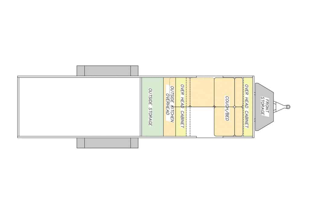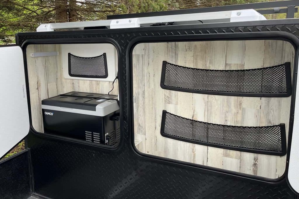 De constructie straalt vakmanschap uit. Een speciaal stalen frame vormt de basis, en de wanden zijn gemaakt van AZDEL – licht, sterk en bestand tegen weer en wind. De dubbele assen met torsievering en terreinbanden maken hem prima geschikt voor offroad-avonturen. Het wooncompartiment is afgeleid van het ‘Country Born’-model, maar met een iets hoekiger vorm voor meer ruimte binnenin. Binnen vind je een opklapbaar queensize bed, verlichting en ventilatie op zonne-energie, en genoeg kastruimte voor al je spullen. Buiten kun je zelfs koken of extra bagage kwijt op het dakrek, terwijl vastgemonteerde sjorpunten het opladen van je motor of ATV kinderspel maken.