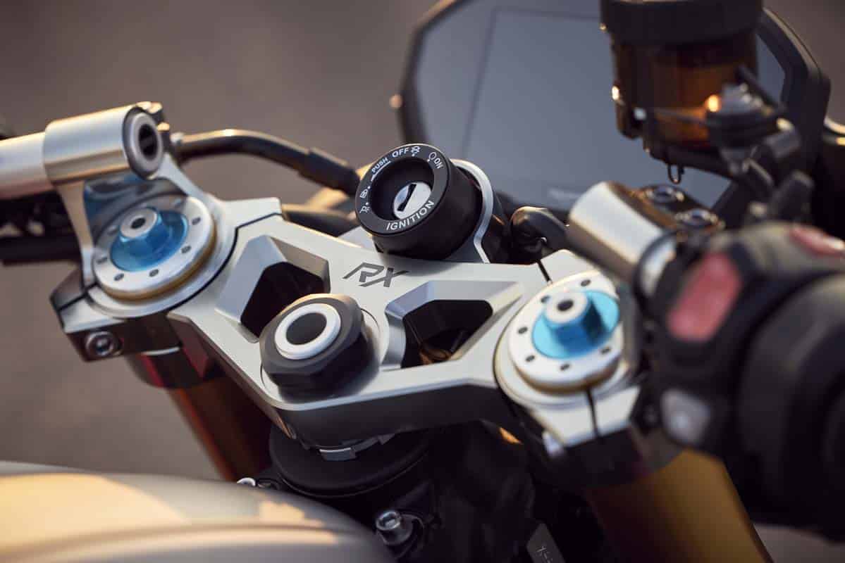 De RX valt op met zijn Matt Aluminium Silver-lak, rood subframe en RX-branding. De Moto2 Edition is gelimiteerd tot 1.000 stuks en krijgt carbonfiber onderdelen, een genummerde kroonplaat en unieke Moto2-details.