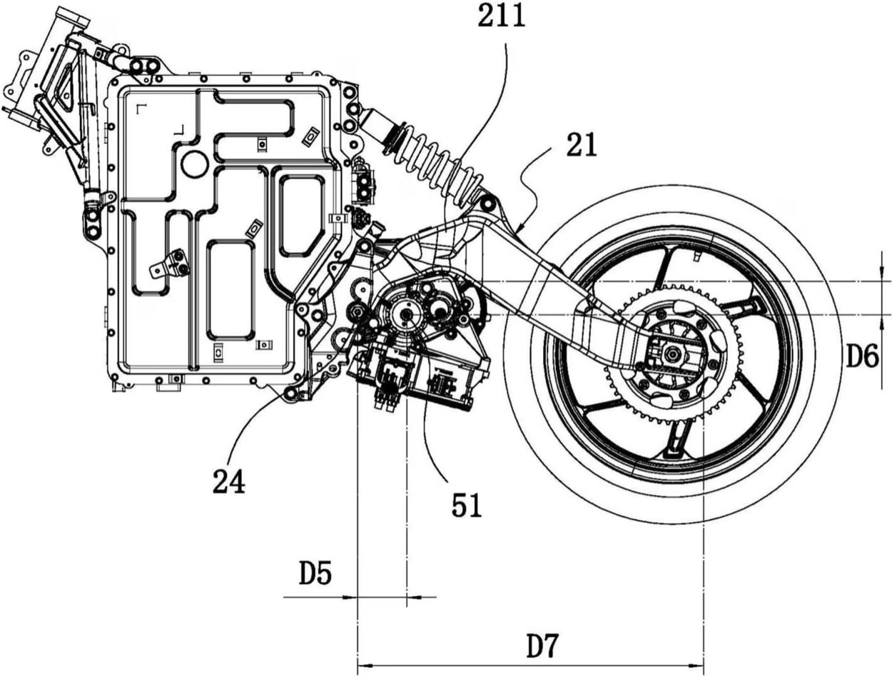In de tekeningen zien we duidelijk dat het accupakket een dragende rol zal spelen. Zowel het voorste deel van het frame, als de swingarm en achterophanging lijken op de batterij gebout, die bijdraagt aan de stijfheid van het geheel. Net zoals we dat recent zagen bij Honda’s WN7. Dat is een logische denkwijze bij EV-motorfietsen: als je toch een groot en stug blok in het midden hebt, kun je dat onderdeel ook structureel laten meewerken. Mee-werken, als in: CFMoto heeft ook aan beide zijden van de accu stukken trellisframe voorzien om de stijfheid te optimaliseren.