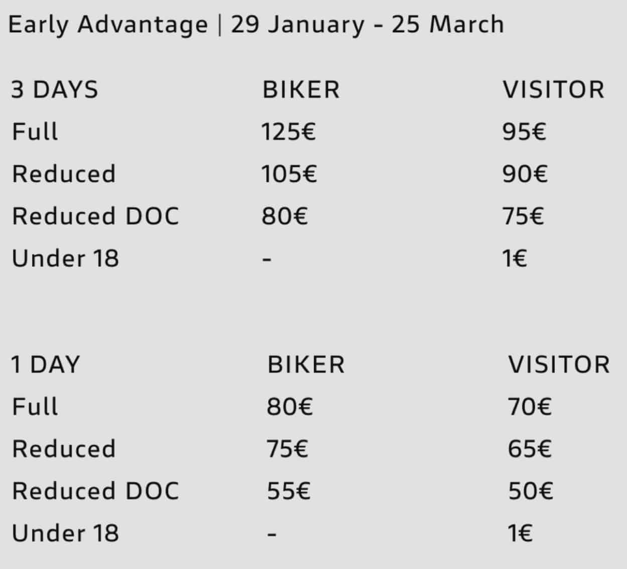 Beide passen zijn geldig voor 1 dag of alle 3 dagen, geven toegang tot de publieke zones van het circuit en laten je gratis deelnemen aan verschillende activiteiten. Voor de tickets heeft het merk uit Borgo Panigale twee verkoopperiodes uitgedacht. Vanaf vandaag (29 januari) tot en met 25 maart scoor je korting met de ‘Early Advantage’-tickets, vanaf 26 maart betaal je de volle pot (Regular Ticket, prijs nog niet bekend).