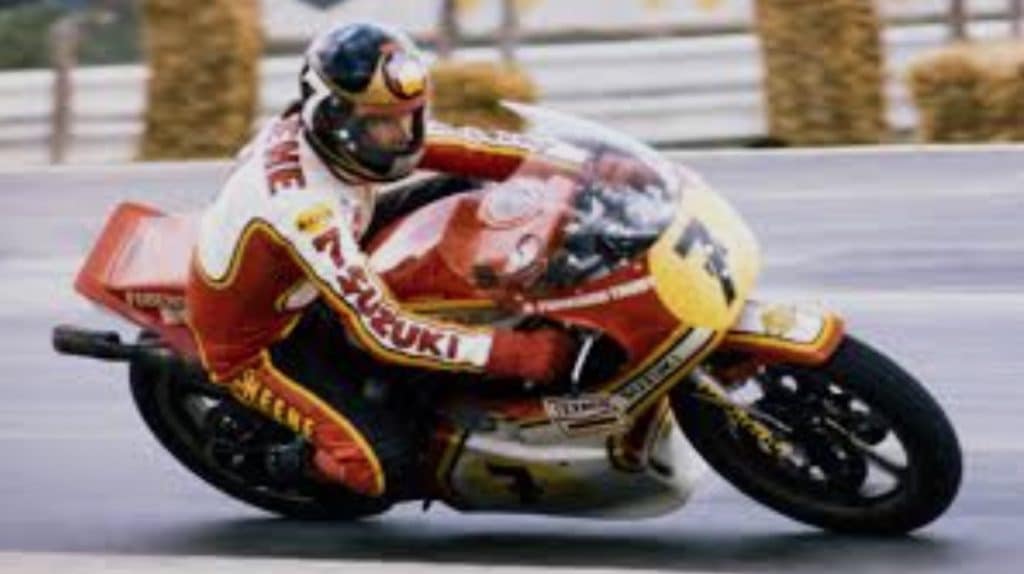 Maar Sheene was bovenal een bloedsnelle rijder, die in 1976 en -77 de wereldtitel scoorde in de GP500. In 1977 won hij de GP van Spa meteen gemiddelde snelheid van 217 km/u, wat nog steeds een absoluut record is. Bedenk je dat Sheene dat deed met tweevingers op de koppeling van een tweetakt Suzuki die vaak de neiging had om vast te lopen, met nul uitloopstrook en een Dainese pak zonder extra bescherming op impactgevoelige plaatsen en je snapt dat hij van geen kleintje was vervaart. Na een crash op Daytona, waarbij z’n rug tot ophet bot werd weggesleten, ontwikkelde Sheene eigenhandig de rugbeschermer aan de hand van helmvizieren, om z’n idee door te geven aan de mensen van Dainese.